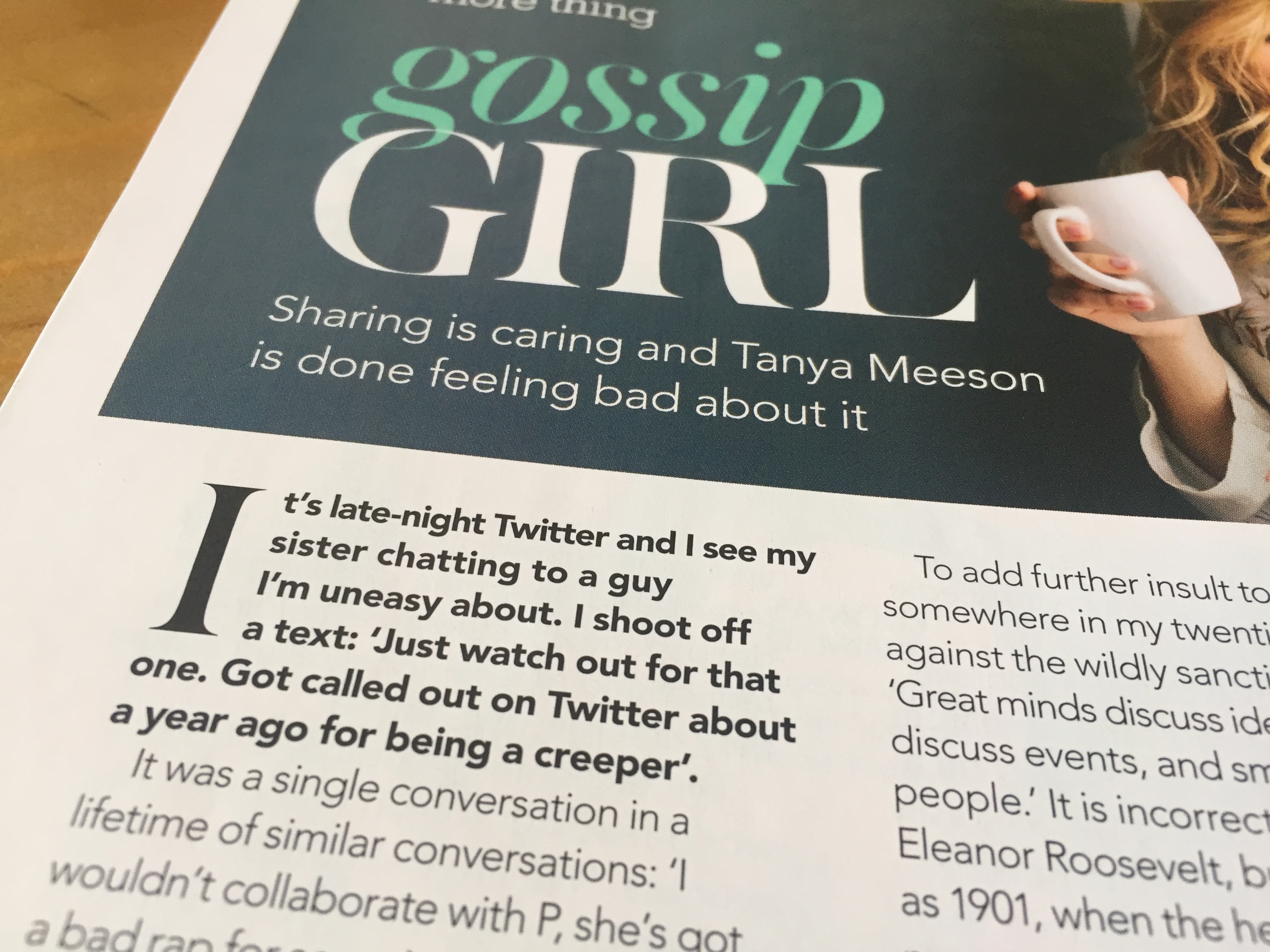 To add further insult to my intellect, somewhere in my twenties I came up against the wildly sanctimonious quote: ‘Great minds discuss ideas, average minds discuss events, small minds discuss people.’ It’s incorrectly attributed to Eleanor Roosevelt, but dates as far back as 1901, when the heart of patriarchal mores, so defined by sexism and classism, was still beating strong.