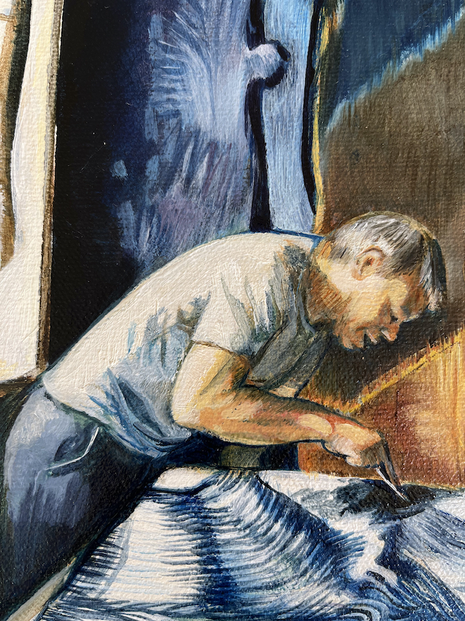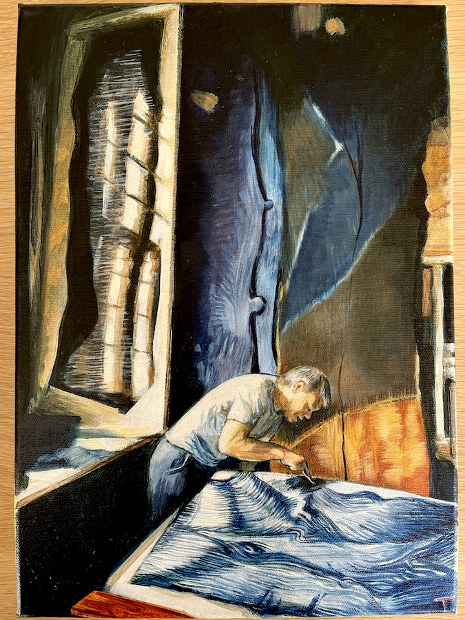 When Insta was still groovy and I was seeing a lot work from makers and painters, I found this 2017 image on PieceWithArtist magazine’s account by photographer Alan Fentiman of printmaker Julian Meredith.